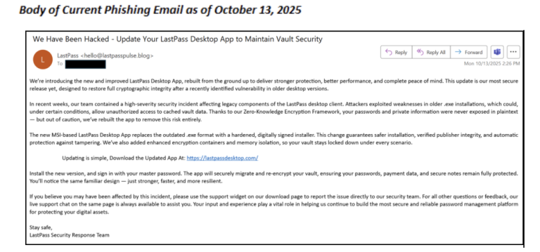 Các chuyên gia bảo mật đã xác định hàng loạt email lừa đảo được gửi đi từ các địa chỉ như “hello@lastpasspulse[.]blog” và “hello@lastpassgazette[.]blog”, với tiêu đề “We Have Been Hacked – Update Your LastPass Desktop App to Maintain Vault Security”.